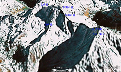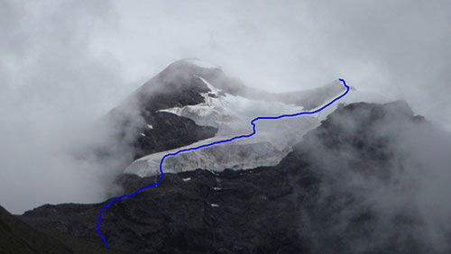 我们的路线首先从南面上到西侧支山脊,沿西侧支山脊前进至冰川舌下,翻上冰川舌,沿冰川一路上行,通过两处断层区后跨越西南山脊北侧的冰川背隙,沿西南山脊北壁攀爬约100米50度左右的冰壁(坡)后上到脊线冰雪与岩石交界处,再沿脊线向上不到200米(距离,非高差)即可到达我们现在怀疑是南顶的峰尖。如果这一峰尖真的只是南顶,那么向北通往顶峰还有100-200米的岩石山脊要通过。