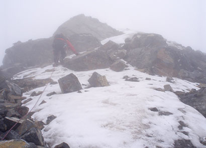 冰坡旁边的岩石上居然有液态融水流下来,在水袋里灌了将近两升,因为这时已经是下午5点,已经可以100%确定要在山上露宿了,像这样补充饮用水的机会必须要珍惜。爬完这一段是碎石,然后又是三四十度的冰坡。在这后一段冰坡顶上,我看见一块数米长的大石,从旁边绕过去,发现原本一直向上的山脊再往前(东)就陡转直下,能见度好的时候可以看见齿牙交错的脊线隐现在低处的云雾里。那么,这就是顶峰了?