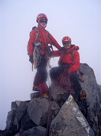 三个人拿赵兴政勉强还能工作的相机互拍相庆。因为之前没有查阅地图,也没有料到能见度居然如此之低(很快连下方的脊线都完全看不见了),并且往北去的山脊也是向下而非水平或向上,所以我们根本就没有怀疑真正的顶峰可能还在北边。当然,也不排除这就是真顶,而地图上的假顶在南的可能,不过现在看来,还是前一种可能更大些。无论如何,在当时的我们心目中,这次攀登就算是成功登顶了,接下来要考虑的是下撤和露宿。