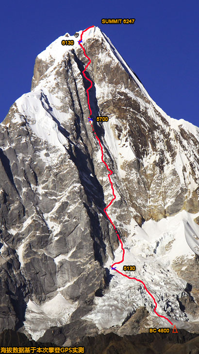 2009年11月23-27日,我们仍然采用轻装快速自由攀登的策略,用几近纯粹的阿尔卑斯方式(只在下撤通过冰川背隙时借用了孙斌队铺设的100米路绳),第三次攀登这条路线。这一次,我们终于在25日18点10分登顶了幺妹峰三座尖顶之中的南尖顶(按照我们手上的等高地形图,南尖顶应该就是幺妹峰的主峰),顶峰GPS实测海拔为6247米。这是幺妹峰中央南壁路线的首次成功完攀,按照我们的了解,应该也是第一支完全由中国人组成的队伍在这座山峰上开辟出一条新路线。我们决定把这条路线命名为“自由之魂”(The Free Spirits),这也是我们两人这个攀登搭档组合的名字。