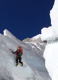 仍旧是6点起床,8点左右从5700米的营地出发。用Reverso的自锁功能沿绳上升比我预想的要麻烦一些,因为台阶很陡,一开始几步几乎是直壁,但是这一段很短,过了台阶就开始沿冰雪坡朝右上方进行行进间保护攀登了。