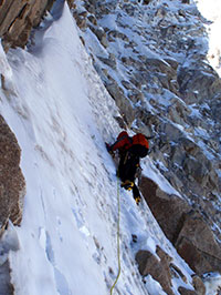 这一段的难度在M4左右(因为是穿着冰爪、拿着冰镐攀爬七八十度的岩壁,并且有几个动作必须要用冰镐钩住岩缝),长度约半个绳距。周鹏先锋,我跟攀完毕之后,把绳长收短到30米左右,然后开始采用行进间保护,两人同时攀登。这一次攀登从头到尾,所有高难度的多段攀登都由周鹏先锋,因为他的攀爬能力比我强得实在太多;能够采取行进间保护的路段则大多是我在前面,因为在我有信心先锋的地方,周鹏基本可以保证绝不会脱落,这样就不用在快挂上加Tibloc,可以最大限度简化操作,节省时间。