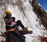 似乎过了无穷无尽的时间——尽管实际上只有几分钟——周鹏终于倒攀完了那几米的直壁,把体重过渡到了靠上面的那根冰锥上。我们决定扔一根冰锥在这里,直接用铁锁挂绳子下降。周鹏先下,还好,半段绳长没用完就到了底。然后我再下,发现连接在锁上的120厘米扁带套怎么都解不下来,无奈中只好把它也留在上面。这样算来,我们在这里总共损失了一根冰锥、一把锁、一个120厘米扁带套。