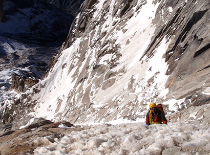 从5700平台往下一路下降,到靠近中央沟槽底部的地方开始倒攀,此时一共下降了9段,加上6130到5700之间的4段和顶峰冰壁下来的1段,这次从南尖顶下撤一共只下降了14段,还不如2月份从5950下降的17段多——尽管2月份我们用了60米的绳子,而这一次只有50米。之所以下降段数变少了,是因为我们倒攀了更多的距离,这样速度更快,被落石落冰击中的可能性更小。