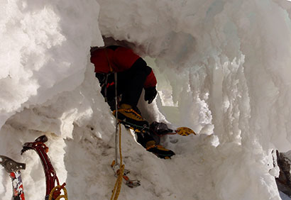 终于,冰柱外面的天色开始亮起来了,这一夜算是熬过去了。我们又烧了两锅水,吃掉了几乎是最后的巧克力、鱼片和干果,然后开始下撤。倒攀下最初一小段雪坡,再下降三段绳距就到了“三角雪”的边缘,从这里倒攀回5700营地上面一点点的台阶上方,又下降半段回到我们存放露营袋、睡袋和部分食品燃料的平台,时间还不到中午12点。