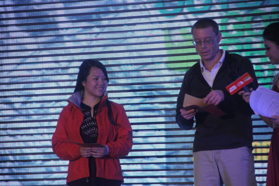 图为登山家Bruce Normand和户外探险杂志执行主编何亦红(图左)上台揭晓最佳攀登成就奖。