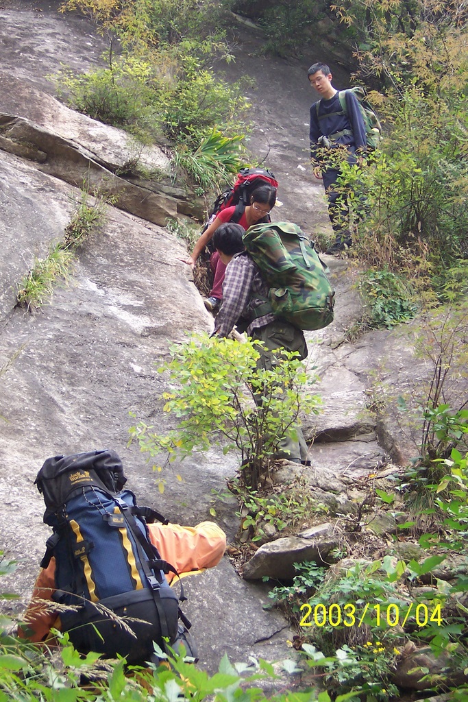 2003.10_冬冬带队穿越云蒙山_enjoylife_2003-10-04_云蒙穿越05_绝望崖接应队员_by enjoylife.JPG
