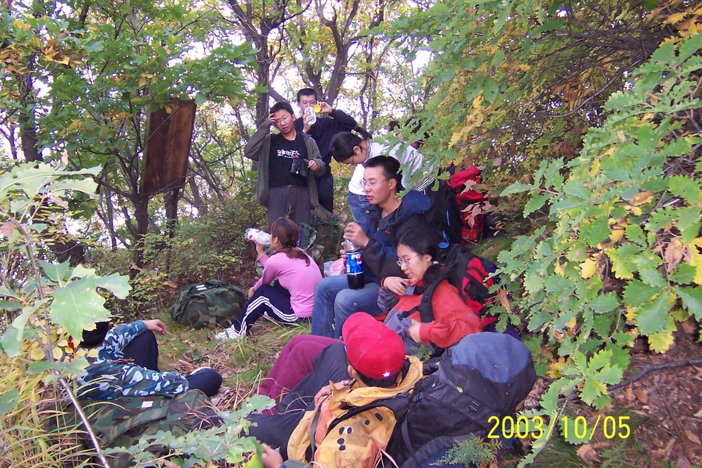 2003.10_冬冬带队穿越云蒙山_enjoylife_2003-10-05_云蒙穿越11_第一块铁牌处休息_by enjoylife.JPG