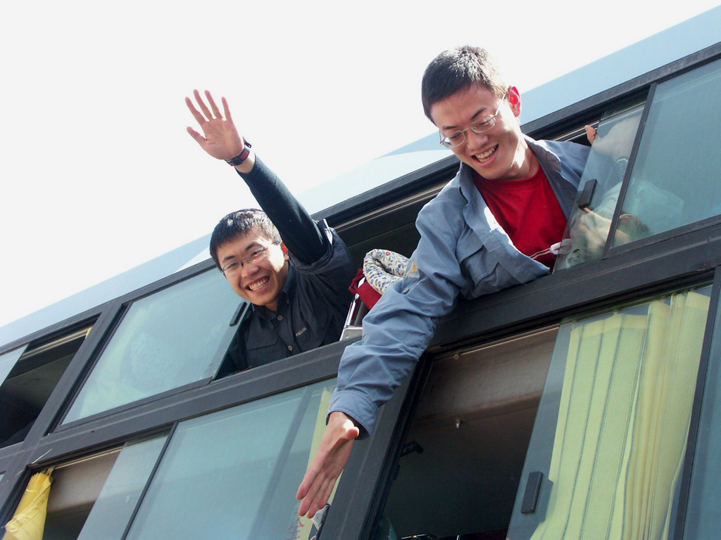 2005.06.29_登山队在格尔木出发,冬冬坐在长途大巴上向科考队招手2_阿颠.JPG
